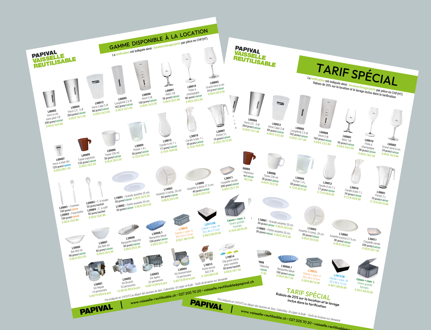 Les tarifs de location et de lavage de notre vaisselle réutilisable sont disponibles ici. Dès 5'000 articles commandés pour votre manifestation, vous bénéficiez d'un tarif dégressif sur certains articles. N'hésitez pas à nous contacter!