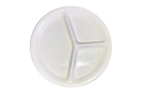 Assiette réutilisable blanche 3 compartiments en mélamine, diamètre 26 cm.